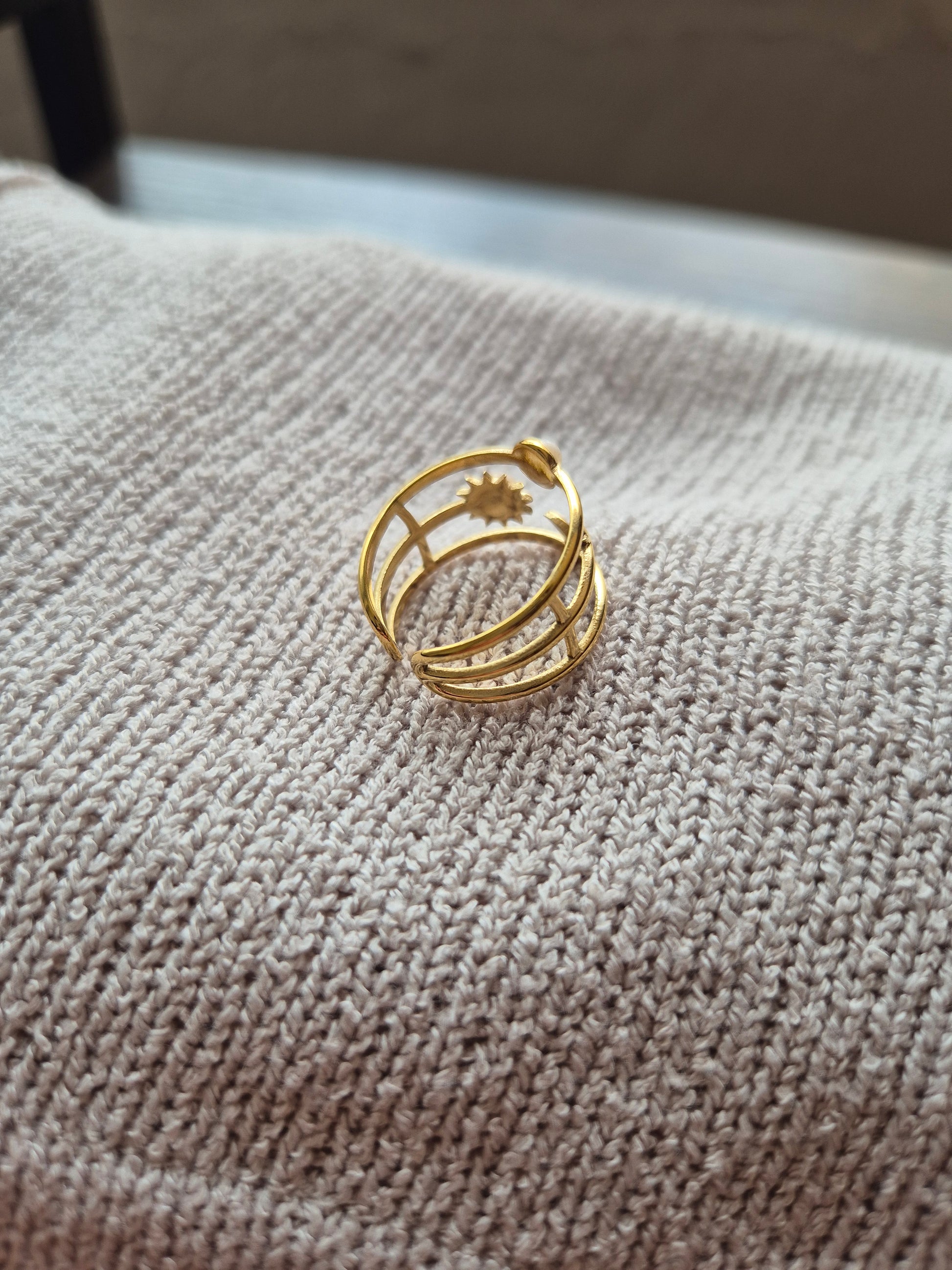 Anillo de acero inoxidable, ajustable, hipoalergénico y resistente al agua, con un diseño original qué muestra la belleza del cosmos estrellas, luna, planetas y sol. Lleva contigo esta pieza única.