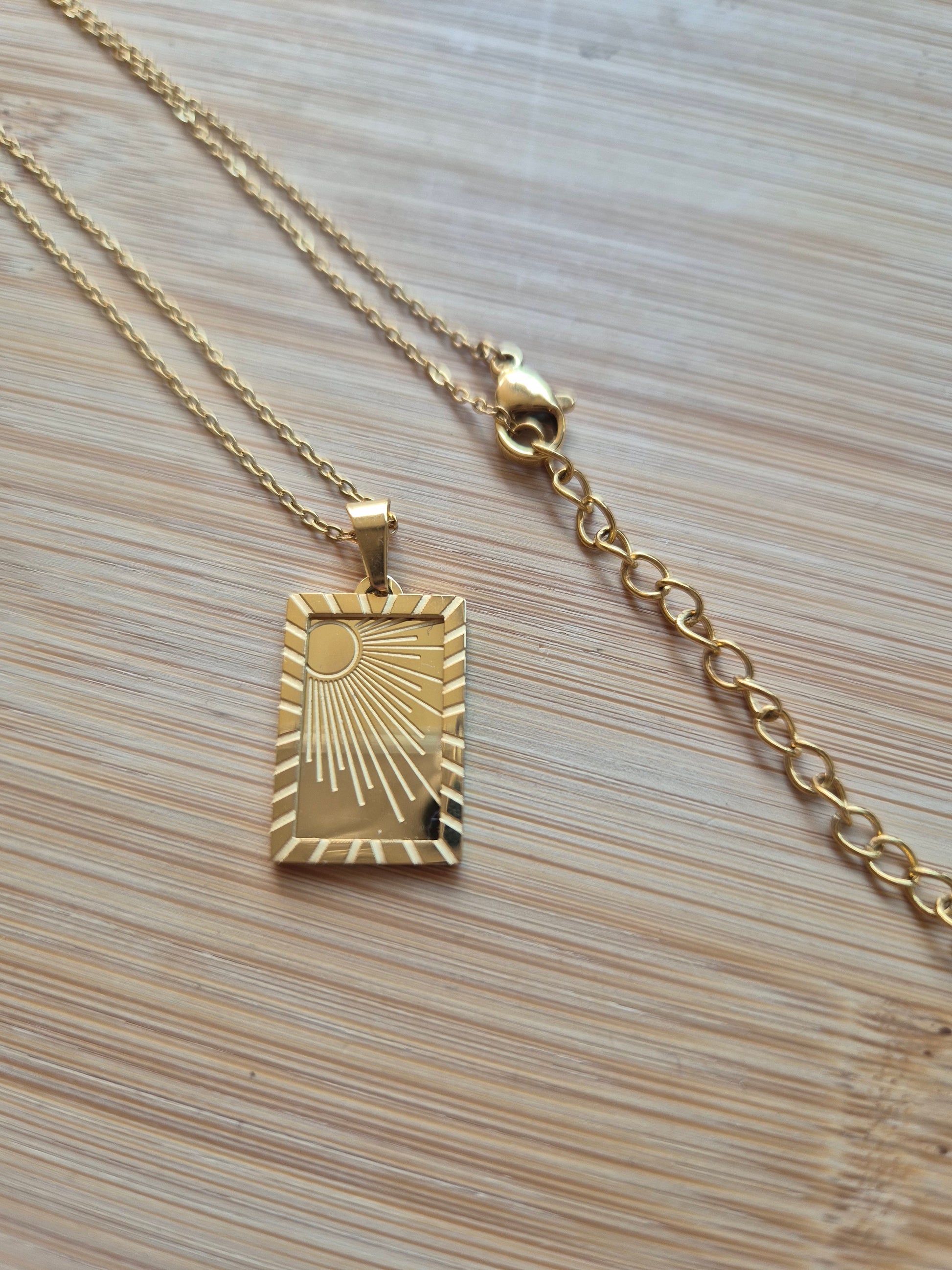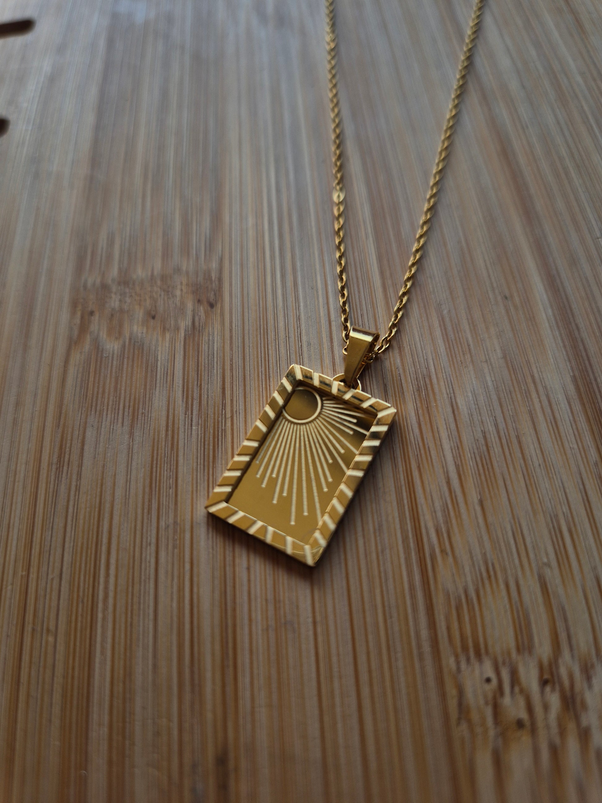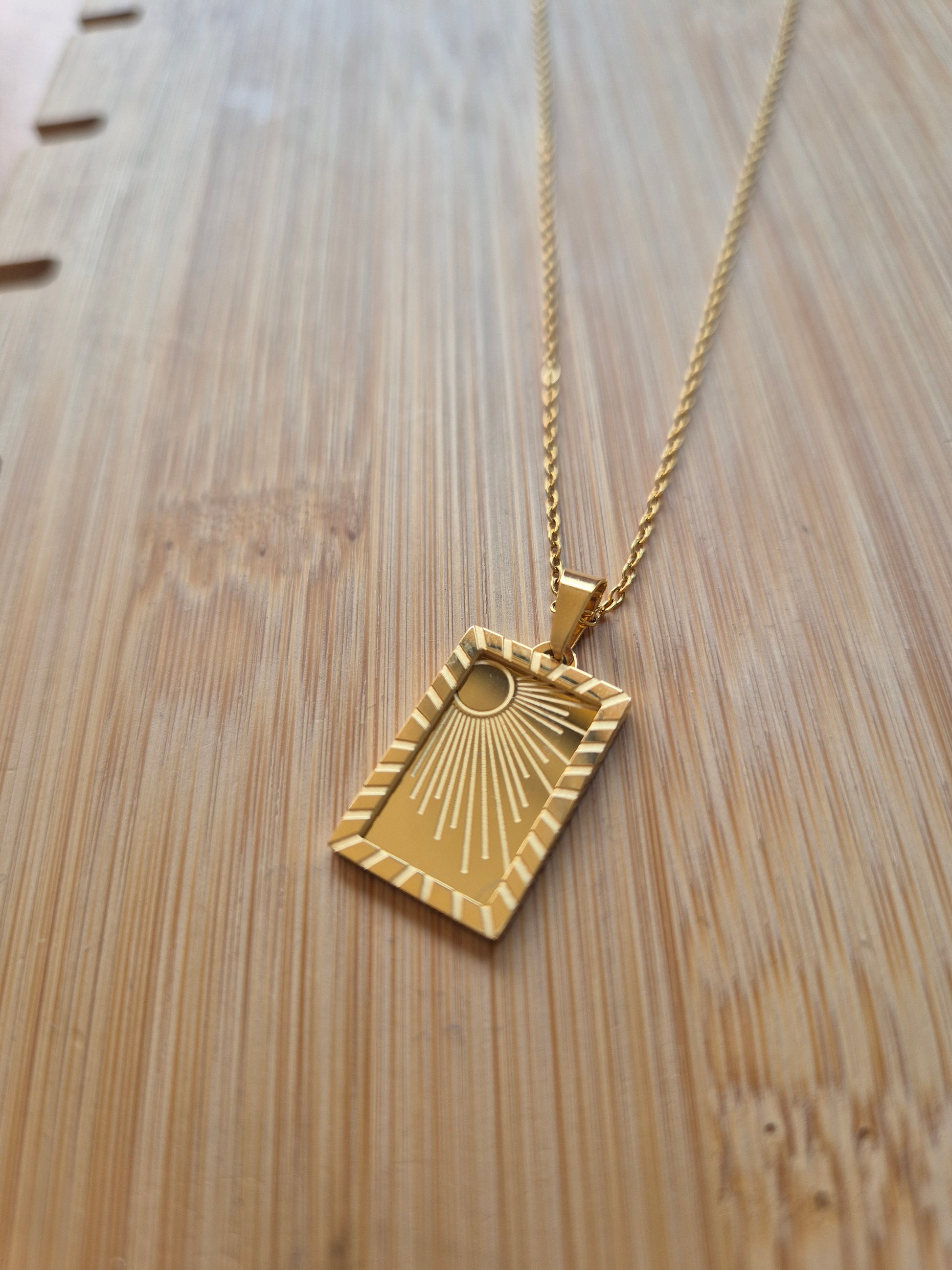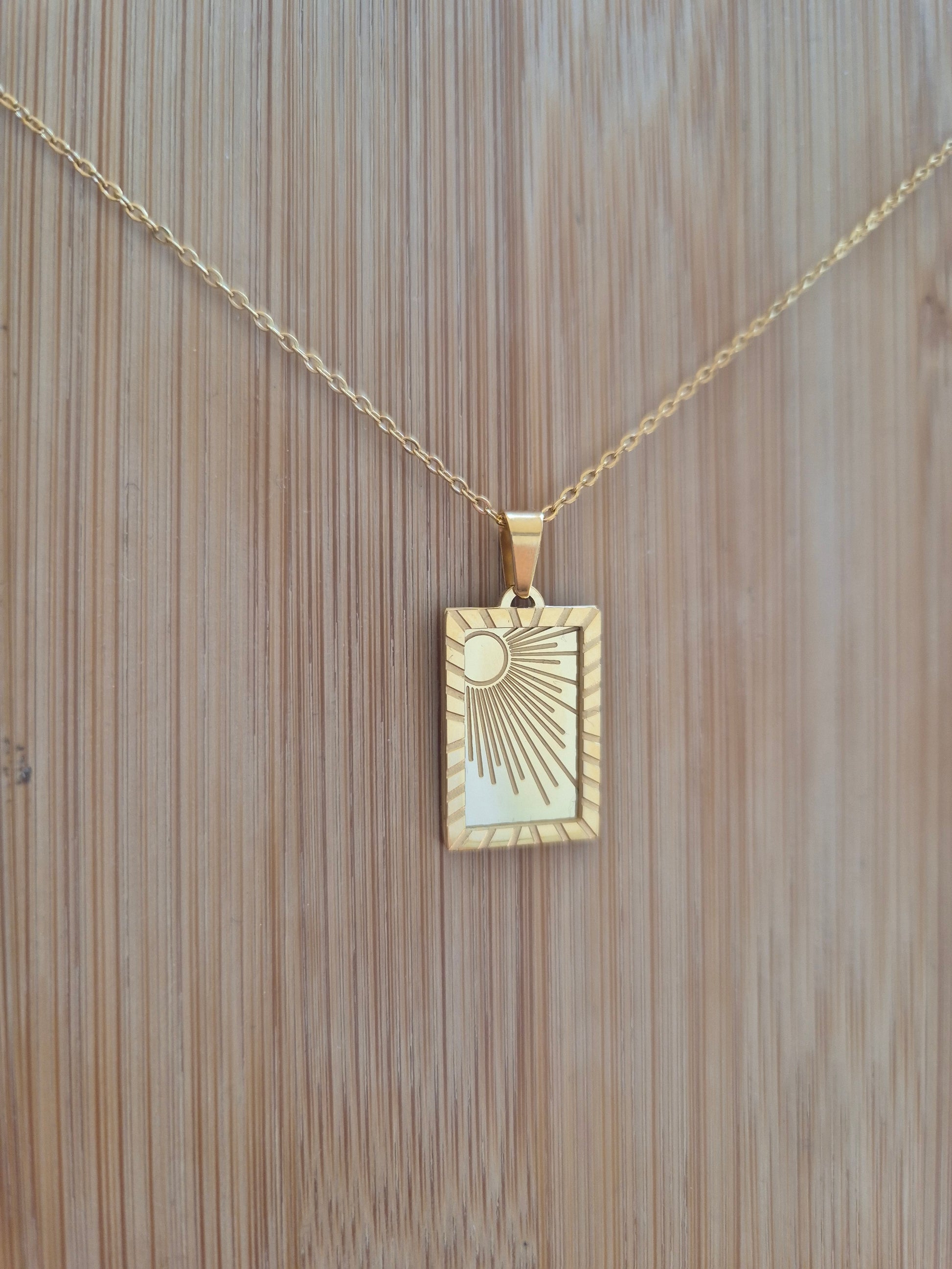 Este collar está inspirado en la calidez y la belleza del sol de California. Su diseño único y elegante captura la esencia de los atardeceres dorados y las playas soleadas de la costa oeste. De acero inoxidable, resistente al agua, 41.5 cm de largo más extensible 6cm, Dije de 1.9cm x 1.2 cm