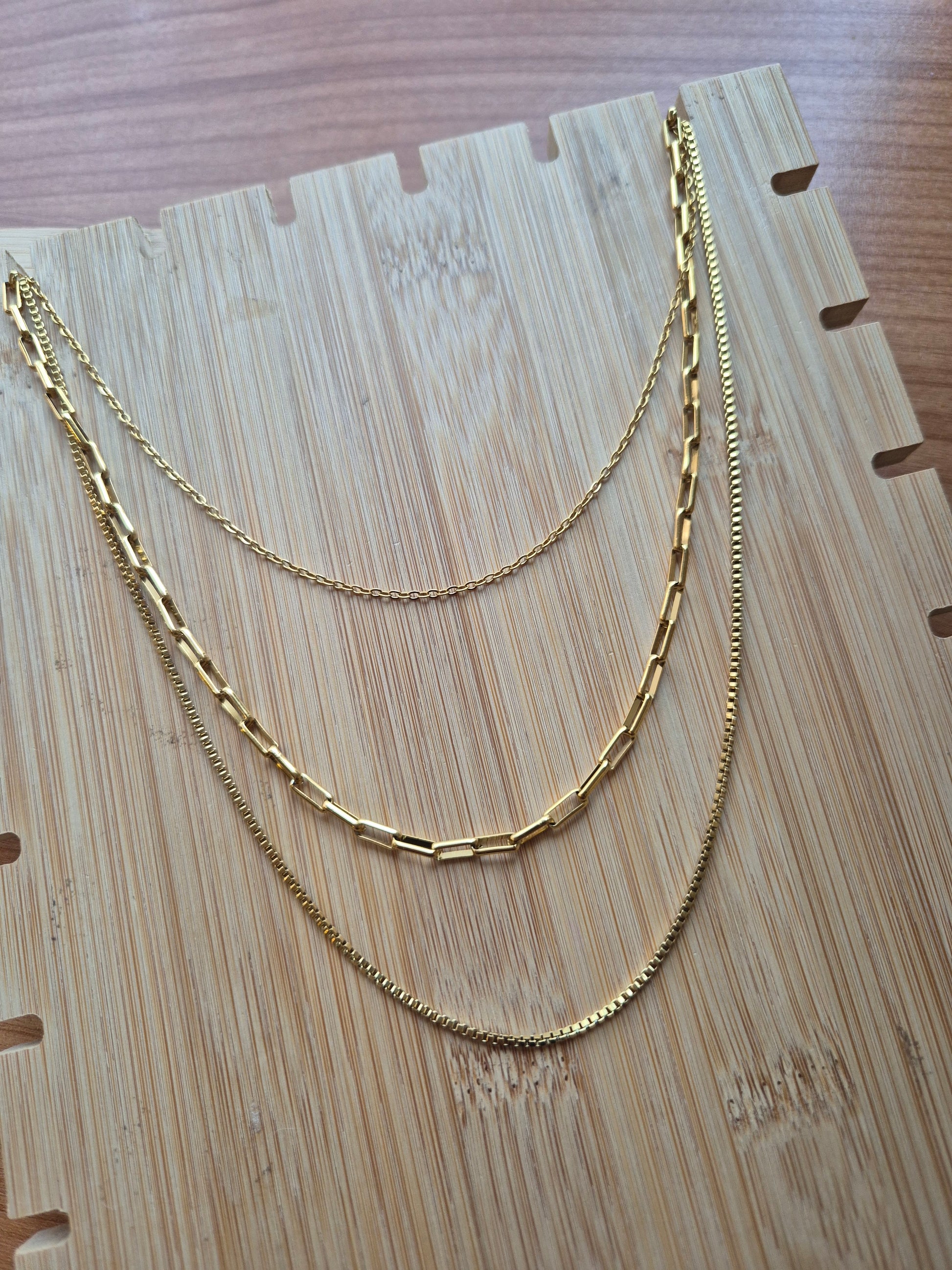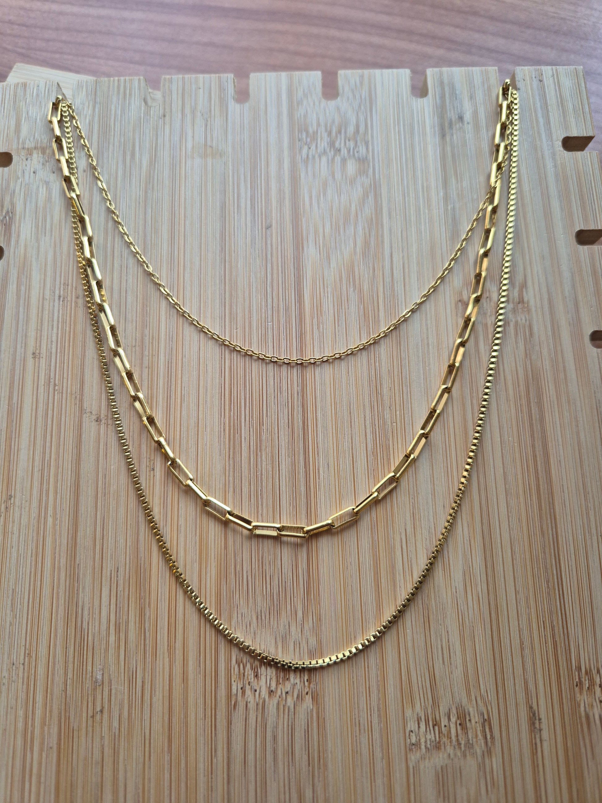 Collar de acero inoxidable, chapado en oro 18k, con tres cadenas unidas, de 36, 42 y 47cm, más cadena extensible de 5cm, con broche de perico.