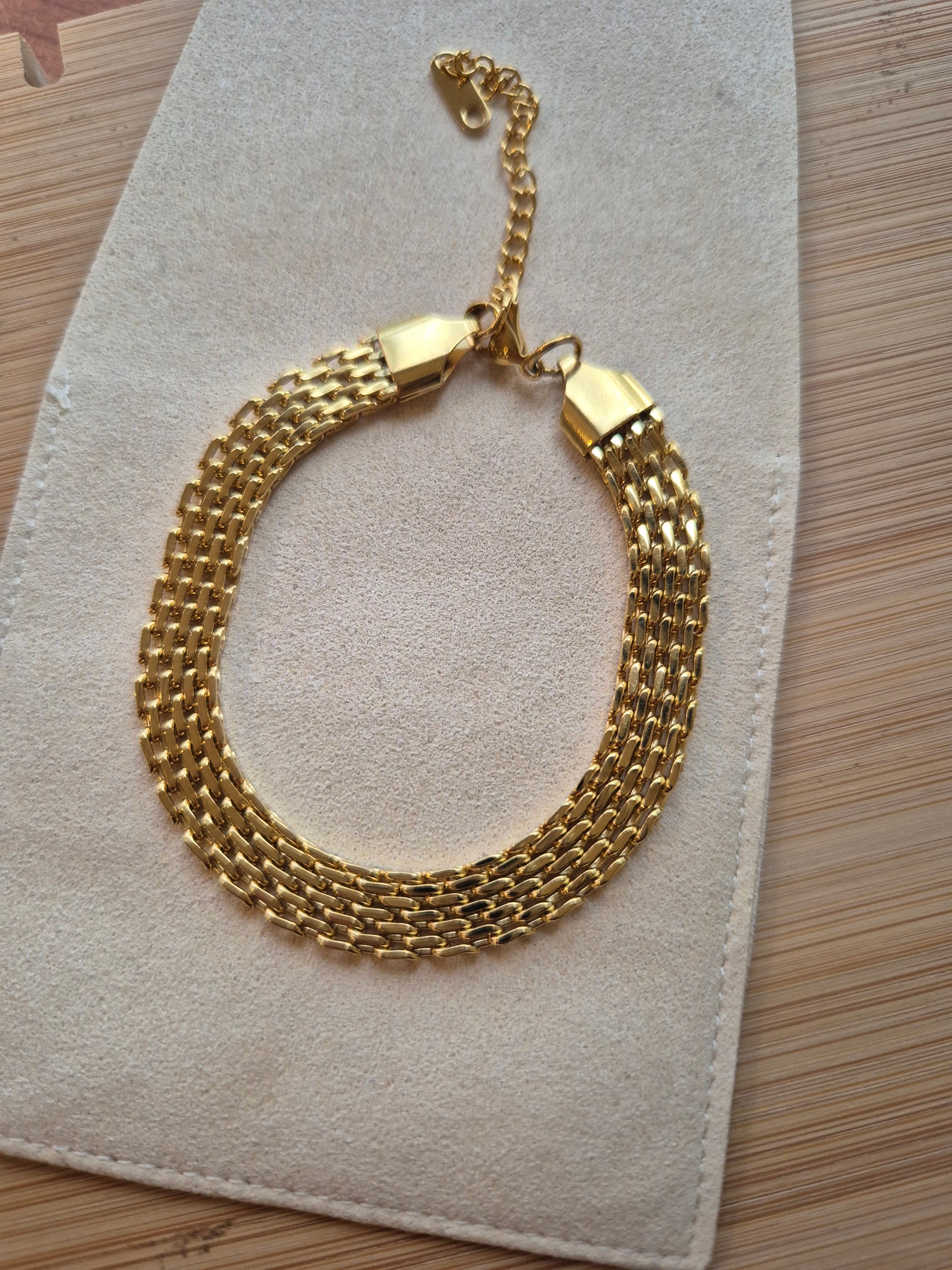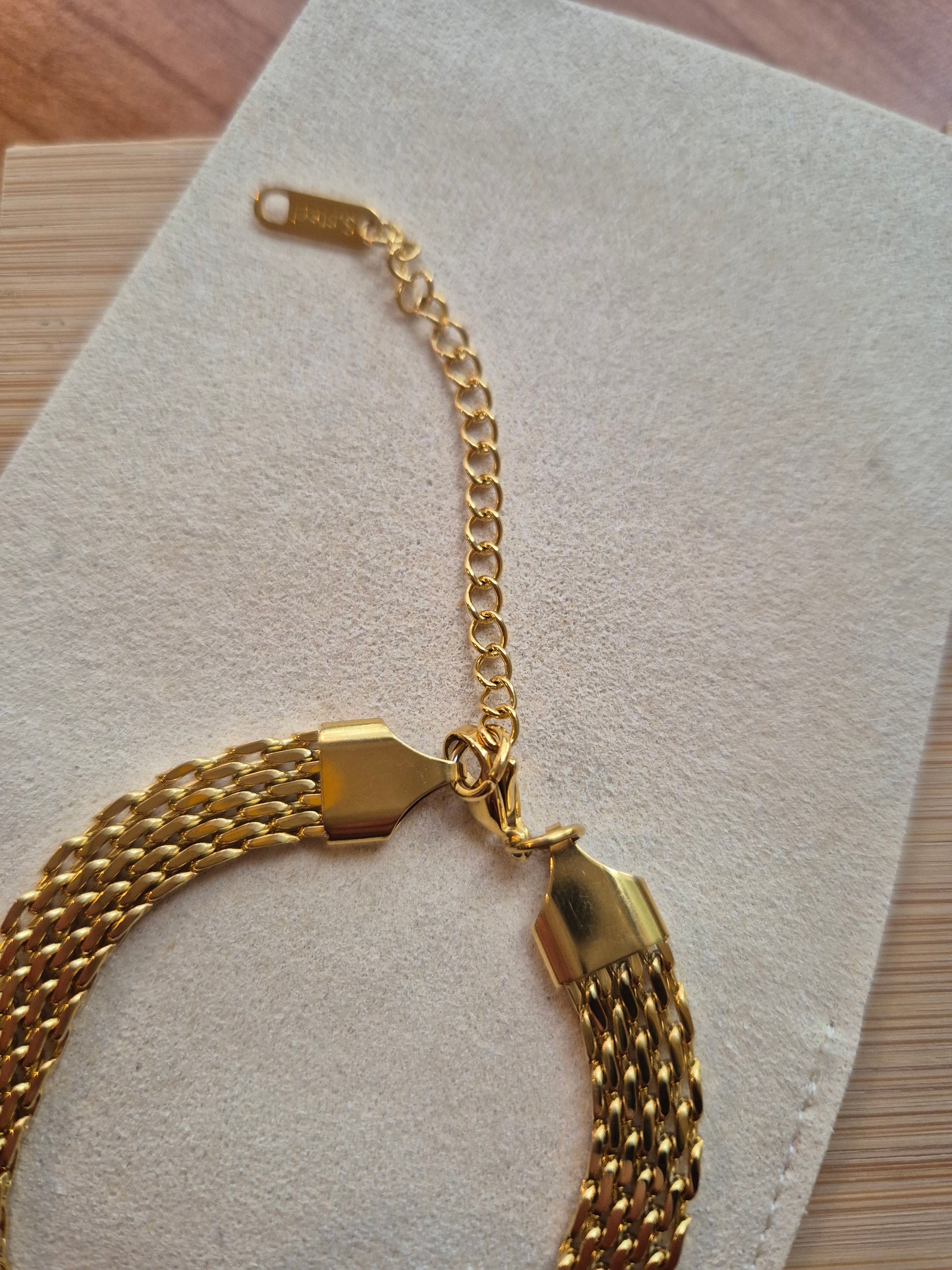Pulsera plana de acero inoxidable, chapada en oro, con broche de perico, de 17.5 cm de largo con extensible de 5cm. De 8mm de ancho.